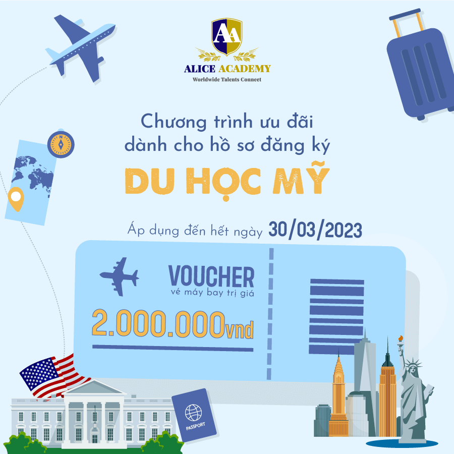 Dành cho các hồ sơ du học MỸ khi đăng ký tại Alice Academy. Đặc biệt, nếu bạn đạt IELTS 7.0 trở lên sẽ được nhận voucher vé máy trị giá lên đến 5.000.000vnd.